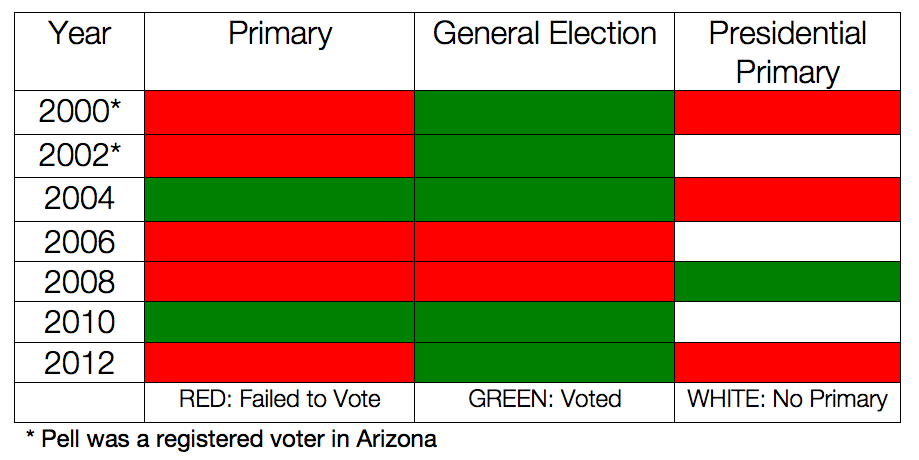 According to information from Arizona Secretary of States Officeand confirmed by the Pell campaign, Pell missed voting in three of the five elections he was eligible to vote in during the 2000 to 2002 election cycles.