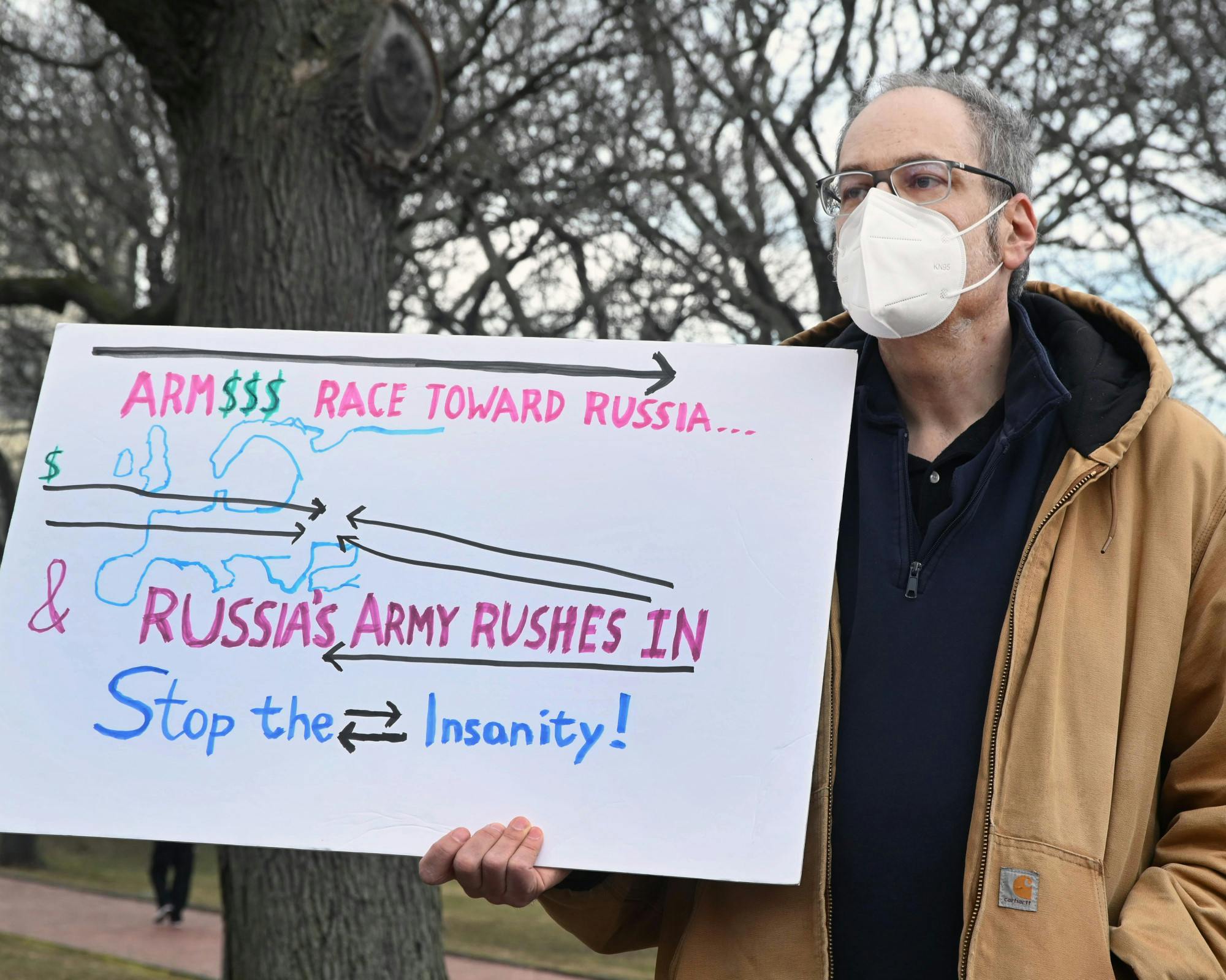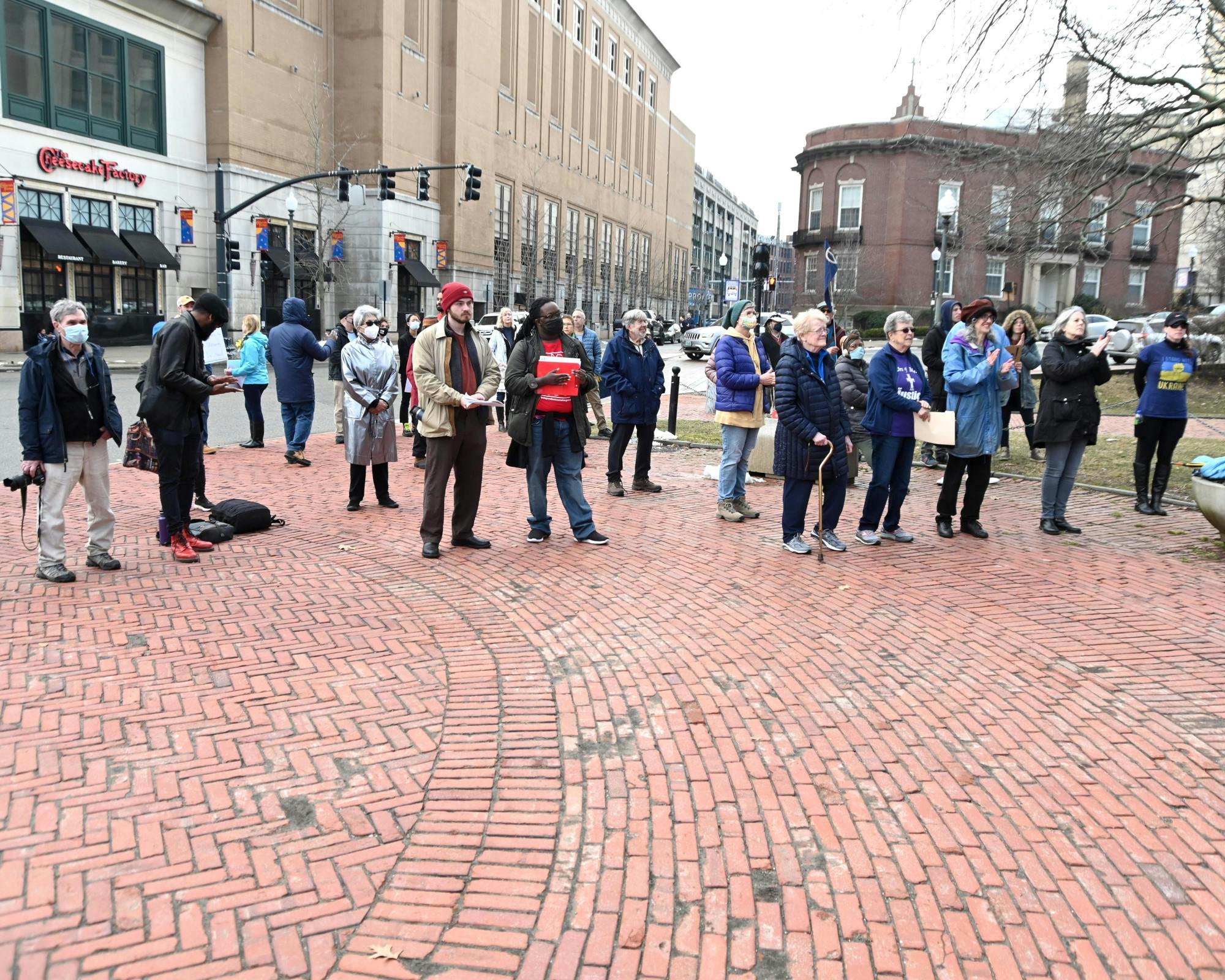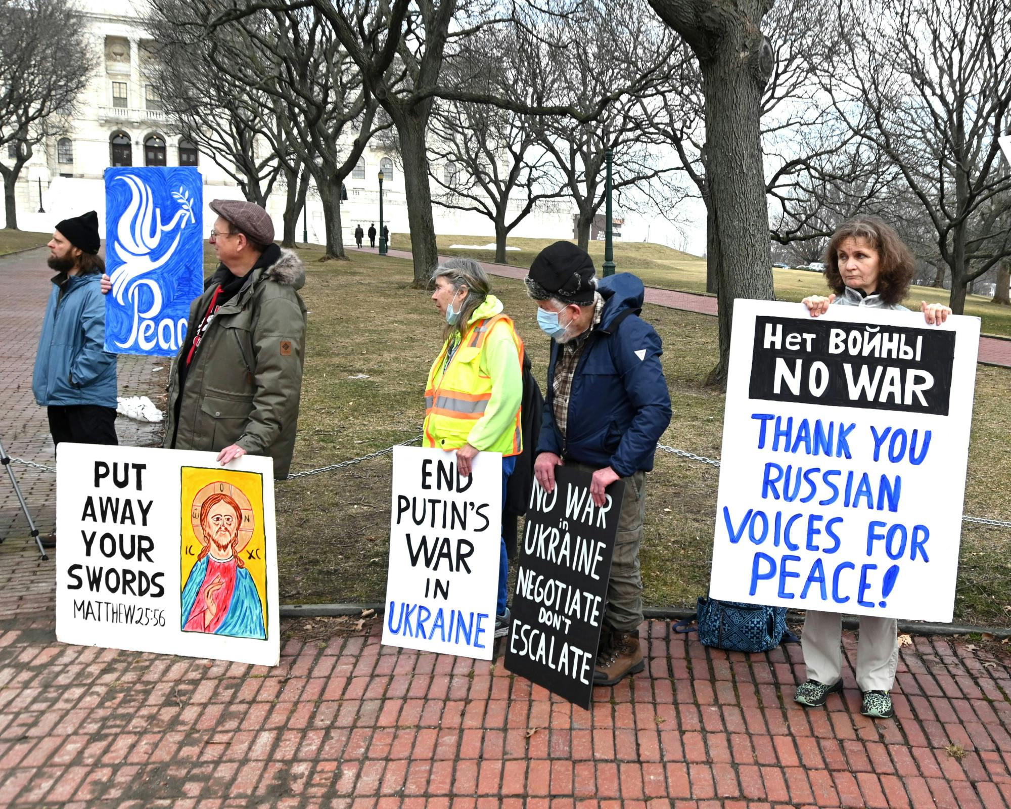 A coalition of groups held a rally at the Rhode Island State House on Sunday afternoon urging American policymakers to promote a non-military policy in response to the Russian invasion into Ukraine.