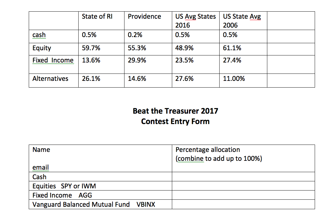 So, use the entry form below the table and pick your mix of assets or ask your current advisor. If you or your advisor beat both me and the Treasurer, then you are eligible for a $500 prize (only one winner the best performance that beats us both). For a guide to how Rhode Island, Providence and pension funds across the United States manage their assets see the table directly below: