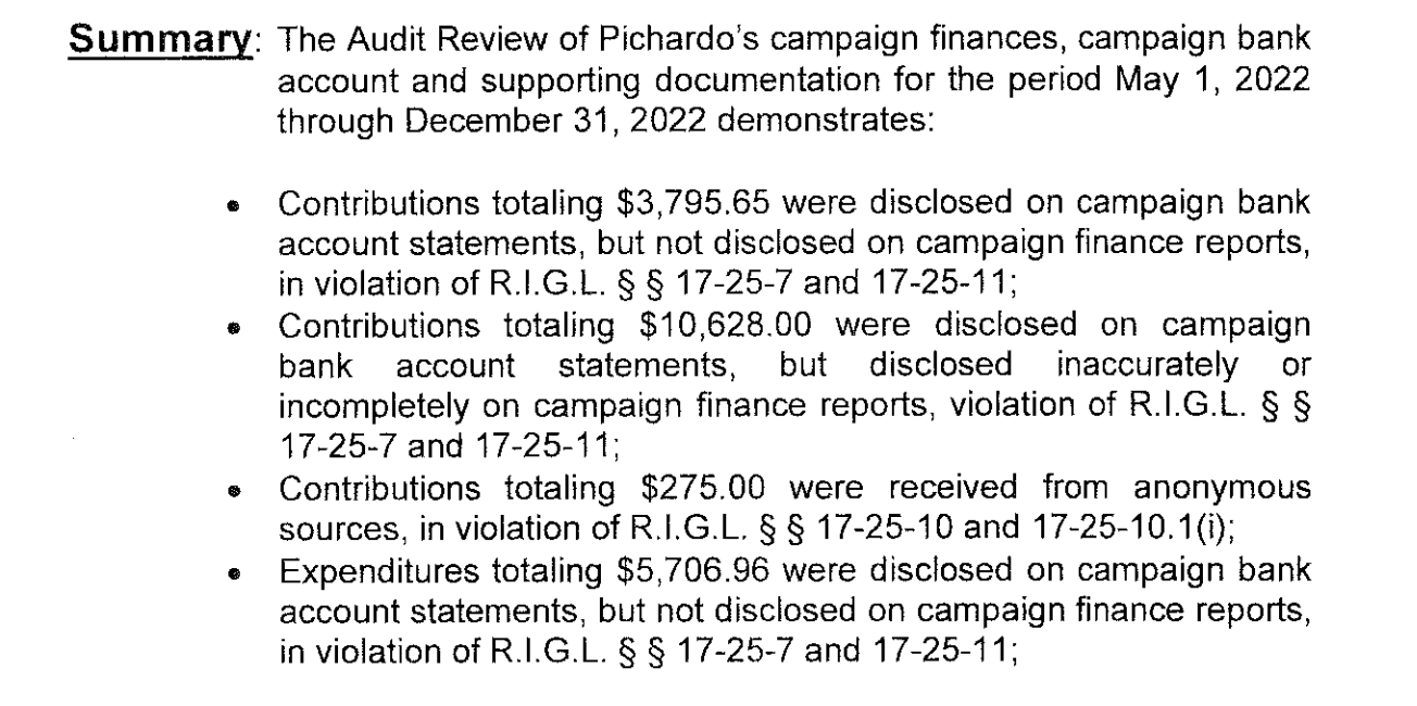 "I want to address the findings of an audit conducted by the Rhode Island Board of Elections on my campaign account and take full responsibility for the errors identified in my campaign finance reports," said Pichardo.