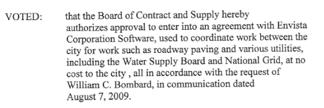 According to records from the Board of Contract and Supply, on August 17, 2009, the Board voted to enter into a contract at the request of the water supply board with Envista. The contract for the first year was for zero, according to an attachment to the meeting notice, which showed that the contract for the second year was for $20,000. It is unclear if Envista bid for the no-cost contract.