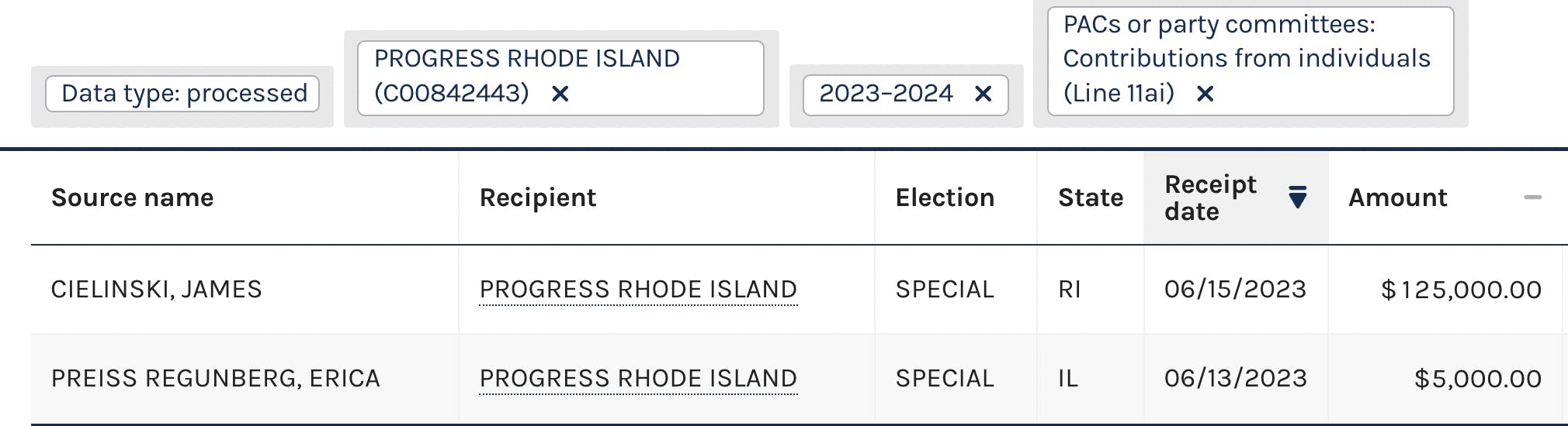 The mailer is funded by a Progress Rhode Island PAC. According to the Federal Election Commission, the PAC has collected $130,000 and has only two funders -- Jim Cielinski who is Global Head of Fixed Income at Janus Henderson Investors, a position he has held since 2017. Cielinski has donated $125,000 and is Aaron Regunberg's father-in-law.