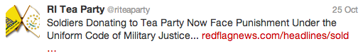 Last week, the fact-checking organization accused the Rhode Island Tea Party of making false claims on Twitter. The Tweet was a quote from the headline to a Redflagnews.com's article, "TERRIFYING! Soldiers Donating To Tea Party Now Face Punishment Under The Uniform Code Of Military Justice?" and included its link.