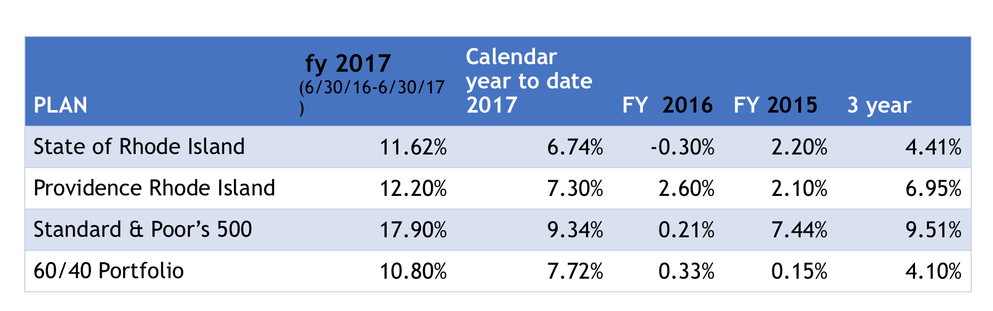 Providence and the State of Rhode Island have officially reported the returns on assets in the pension plan for the fiscal year that ended on June 30, 2017.