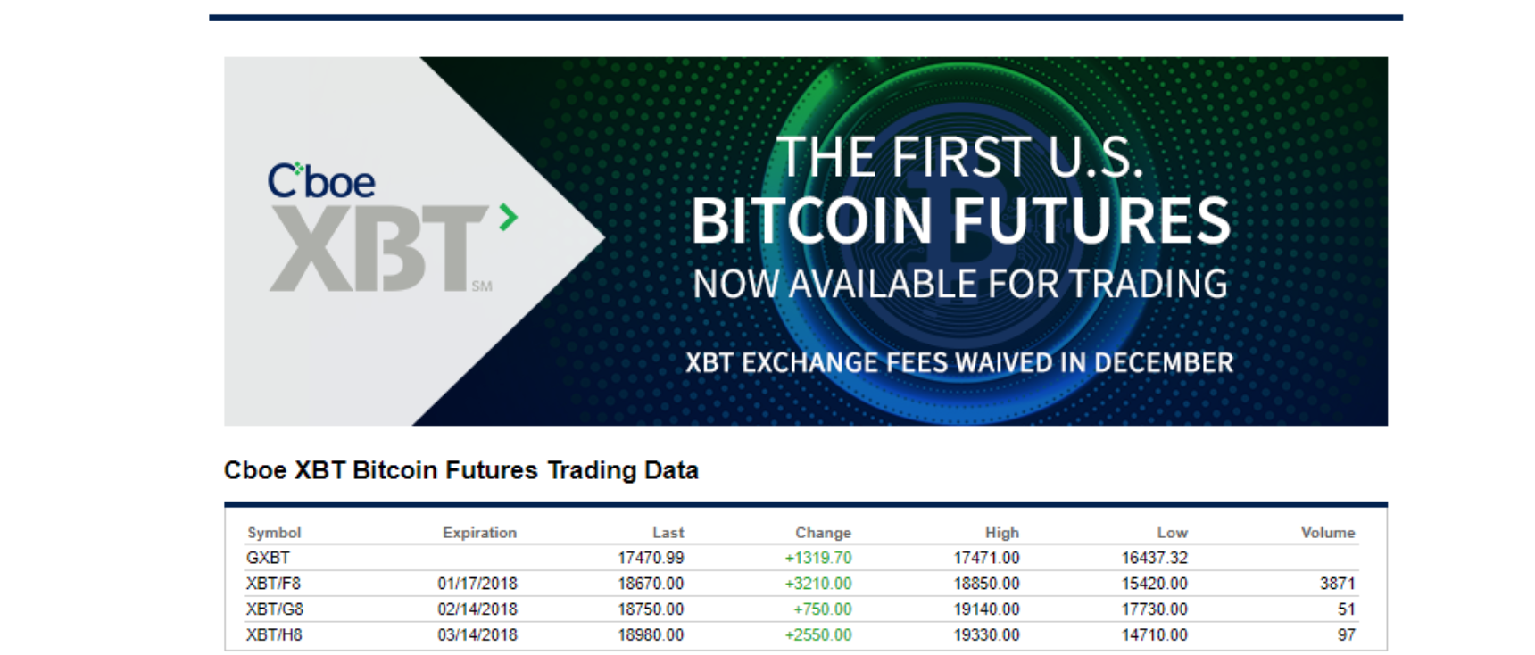 Long-term perspectives dominate the commentary. For example, Warren Buffett says he can’t value Bitcoin,“so it's worthless.” Nobel prize winner Robert Shiller, another skeptic, advises “don’t put your life savings in it, OK?” On the other side, the Winklevoss twins founded the Gemini Exchange where Bitcoin auctions take place and serve as the main source of pricing for CBOE’s XBT (Bitcoin futures). The futures are listed for January, February, and March 2018 and are to be settled in cash on expiration day. The Winklevoss Twins have been referred to as the first “Bitcoin Billionaires” and have been notable long-term bulls believing that Bitcoin will be a “Gold disruptor."