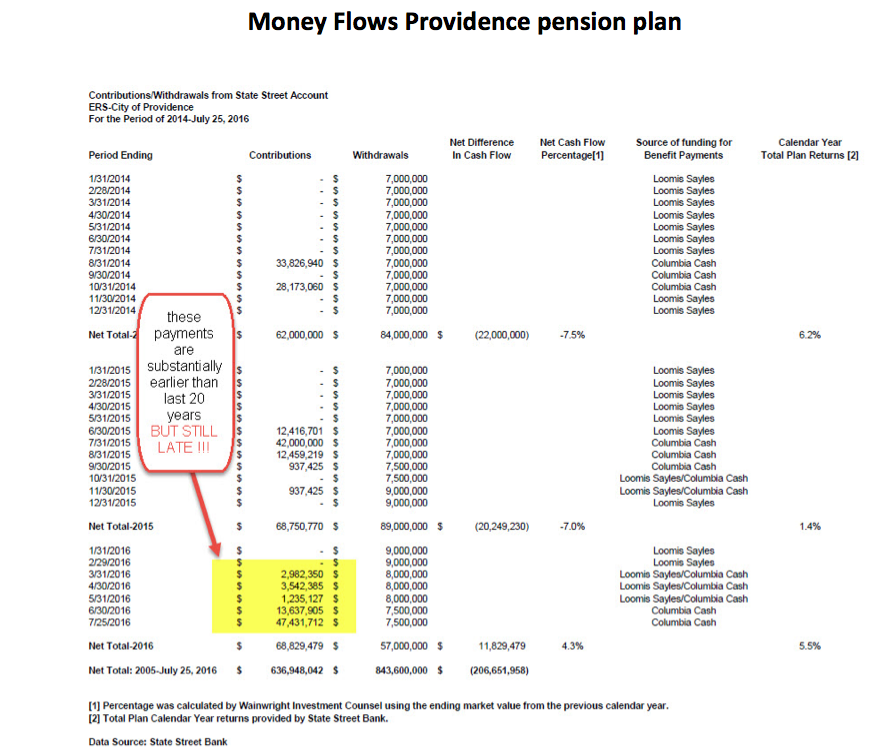 Providence has just stunned me by its actions and Mayor Elorza has almost fulfilled a promise to pay contributions to the pension plan in the same fiscal year that he allocated contributions to the pension plan. This is the first time this has happened in at least a decade and probably 20 years. How did he do it? Where did the money come from? So now the assets in the pension plan are real and at year end assets totaled $246 million dollars. An additional $47 million was deposited on July 25. After the July 25 deposit flash assets are $295 million. The adviser, Wainwright Investment Counsel LLC, has taken the extra step of showing the actual cash flows to and from the fund. The chart below shows the enormous inflow of funds to the plan in the last few weeks of June and July 2016.