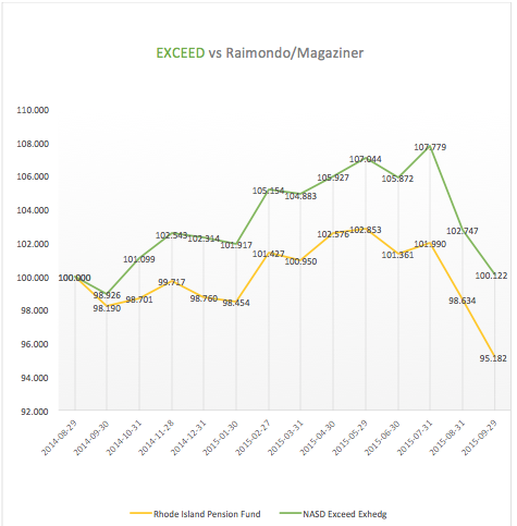 There is however a bigger stink emanating from Rhode Island and that is the effect of insider corruption that is invisible yet pervasive. Consider my experience with trying to help the State of Rhode Island Pension System by introducing them to an innovative new investment product that could eliminate all hedge fund investments and costs. The product in fact is so powerful it could easily eliminate 95% of the paid outside money managers and consultants that are currently paid by the State and whose performance has been very discouraging. Long story short after a few meetings we were rejected. We needed to have at least $1 billion in assets to be considered said Cliffwater, the consultant. Raimondo never met with us, only staff. The charts that appear in this article show the performance of Exceed Investments “buffered “ or “hedged” index versus the State and the S&P 500 as well as the city of Providence. The indices were listed in September 2014 and we now have 1 full year of investment performance to compare to Providence and the State of Rhode Island pension fund performance.
