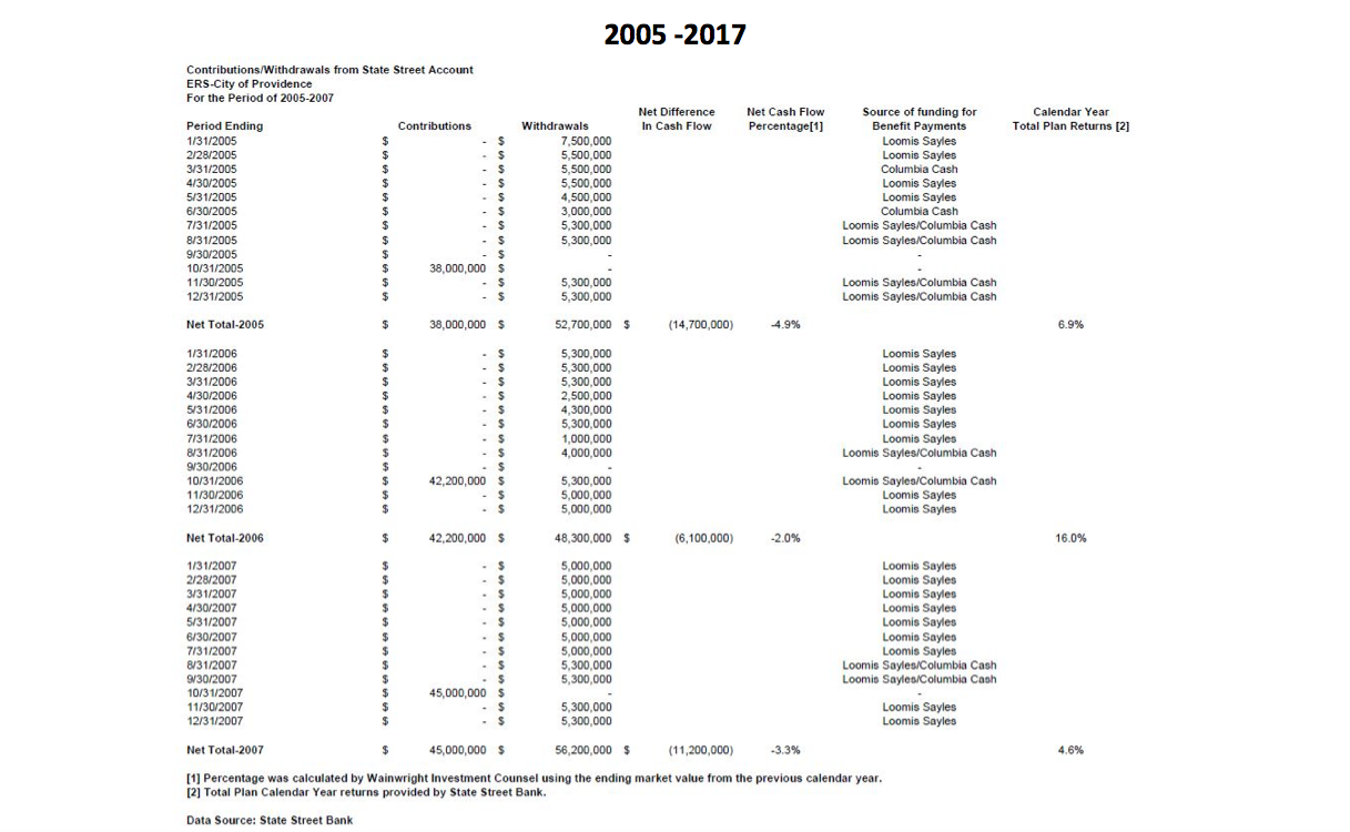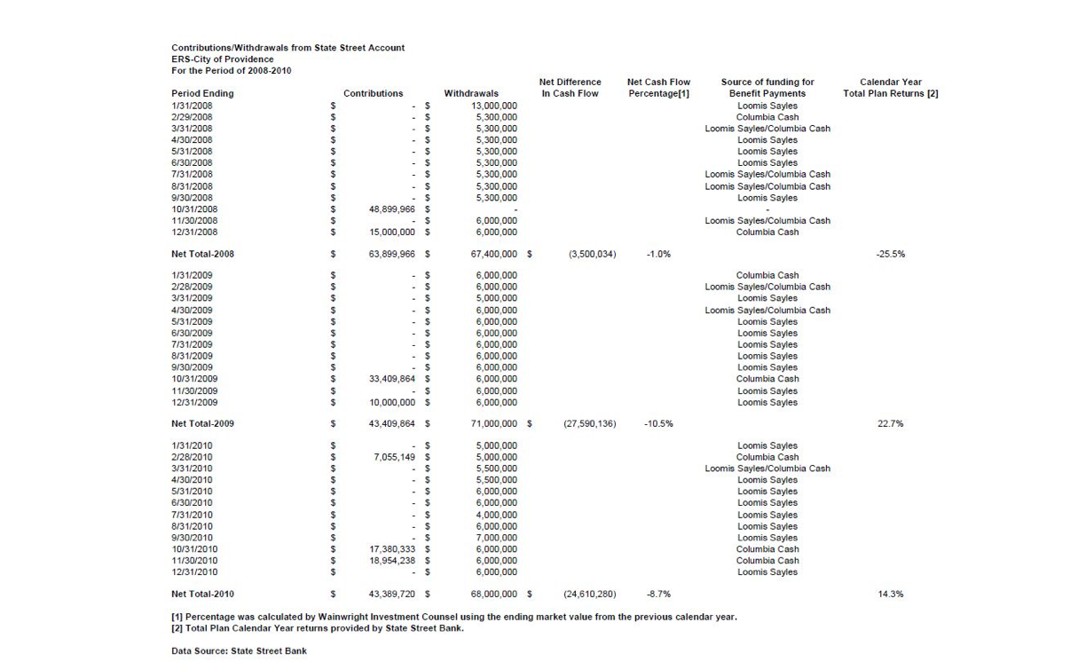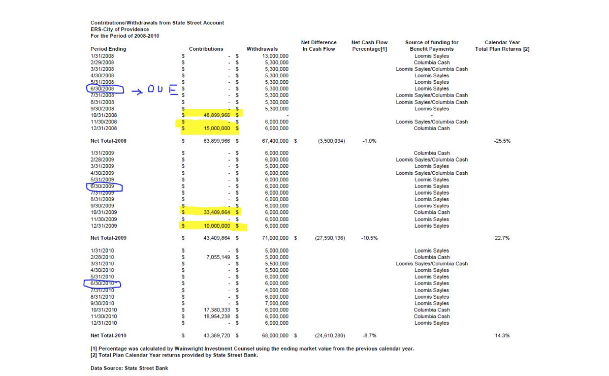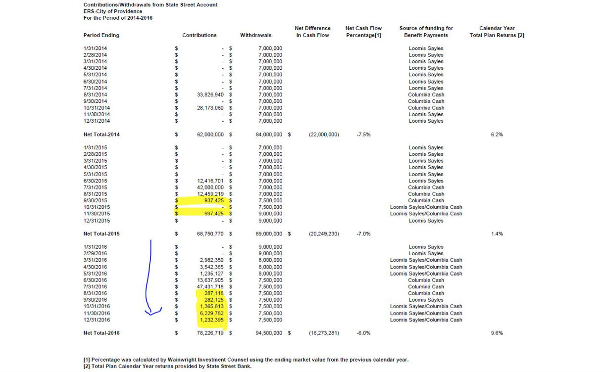 Also around the same time, I identified a mismatch between Advisor Wainwright Counsel LLC-claimed returns on its portfolio and the actual return on assets as stated in the CAFR. About a year ago Wainwright began publishing cash flows received from Providence showing how late the city has been since 2005 in contributing pensions to the trustees for investment.