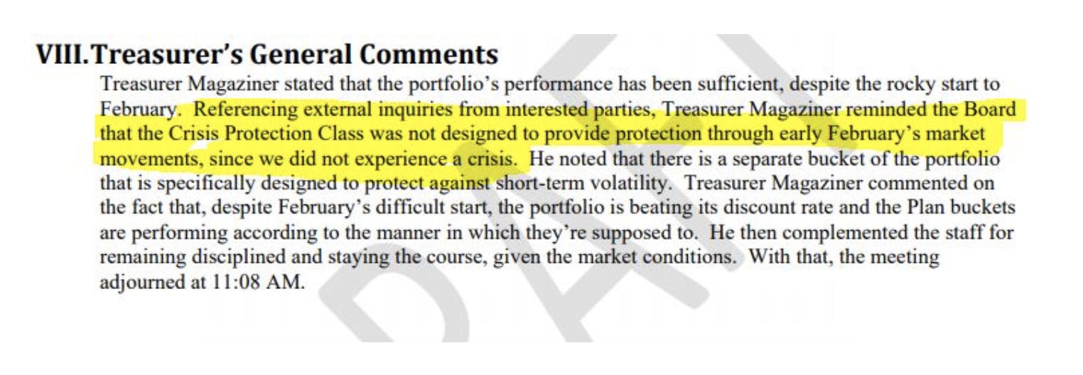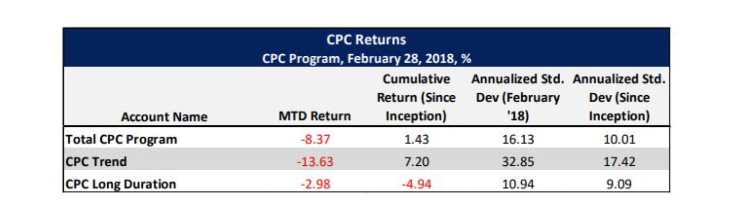 It turns out that the Treasurer either didn’t understand the “CPC” (Crisis Protection Class) trend following strategy that he chose as his hedge fund substitute or he was talked into this bad investment by highly paid consultants.