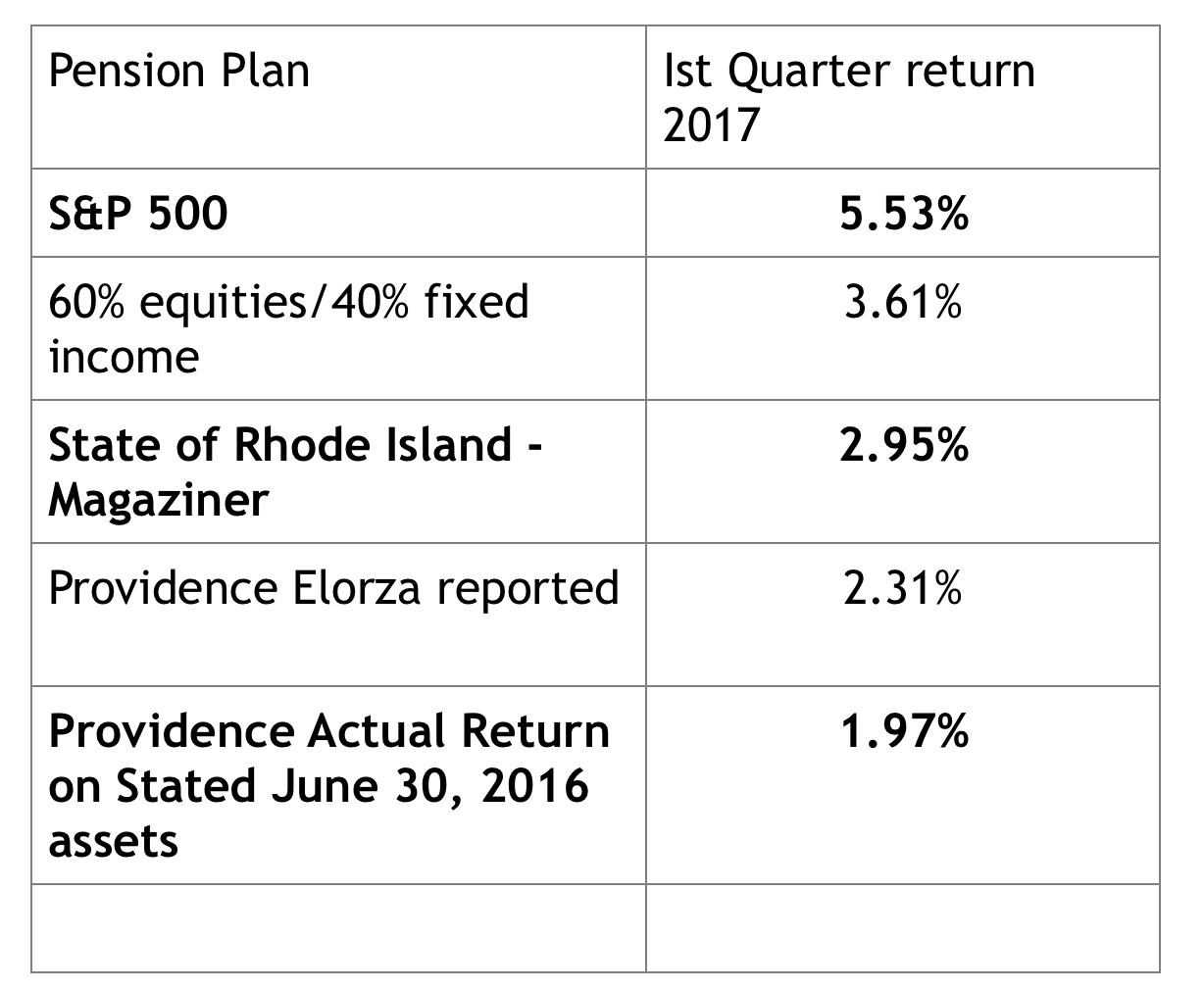 Providence's first quarter result is shown in two ways, because of Providence Mayor Jorge Elorza’s unique and misleading reporting of both Pension assets and returns.