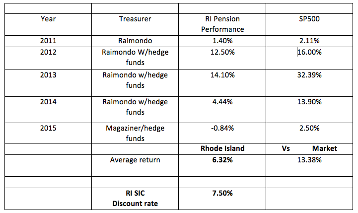 In terms of the budgeted shortfall, the RI State pension fund is expected to GAIN 7.5% compounded for the next 25 years. Therefore the plans return shortfall, actual returns vs expected returns just for the last 13 months, was $895 million. The State Pension Fund Shortfall since January 2014 now exceeds $1.1 billion. As Treasurer, Raimondo said in 2011, eventually this liability will be on the taxpayers back and there will need to be cutbacks to employees. Again.