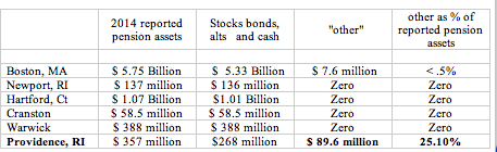 The reality is that there is only $268 million in assets invested by Providence to pay for what in 2 months will be shown to be at least $1.7 billion in liabilities. Fully 25% of the supposedly $357 million in assets fall into loan receivables and “other." This is highly unusual accounting, possibly criminally misleading so I decided to try and find a city in Rhode Island that had the same treatment or characteristics. There were none. Then I tried 25 top cities all over the United States. Again there weren’t any cities that accounted for pensions or pension assets this way. I have created a table below showing what cities have reported as Pension Assets and the amount that is invested by each city in stocks, bonds, funds and cash.