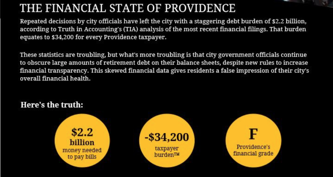 The report issued last week by Truth-in-Accounting did not include Providence because it is not one of the most populous cities in America (it’s around 174th). However, Providence is one of the most debt-burdened cities in the United States and is ranked in the top 5 worst for honest accounting and taxpayer burden.