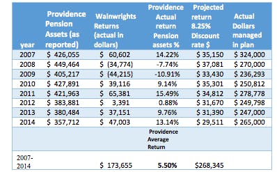Below is a chart of 2007 to 2014 Providence Stated Pension assets and the actual Investment Returns of Wainwright Investment Counsel LLC. Providence officials, their Actuary and their adviser Wainwright Investment Counsel LLC claimed they would return 8.25%. The returns have actually averaged 5.5 % on reported assets since 2007. That is a $95 million shortfall in returns from the 8.25% discount rate that providence and its actuaries use. Neither Providence nor Wainwright could be reached for comment.
