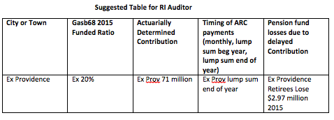 We know that Providence for example has been falsifying its assets in the pension plan for decades now. The Auditor General should asterisk and restate all the years going back to 1995. The auditor general should also produce a study explaining Providence policy of withholding ARC payments until year end or worse. We would like to see if any other towns in Rhode Island are doing the same thing. We would also like to see how actuaries are accounting for the cash flows. I’ve built a table for Mr Hoyle’s use. The Raimondo/Chafee municipal pension commission was a complete waste and Mr. Hoyle served on that commission. How about a real status report in 2015 on the cities pension and OPEB funding Statewide?