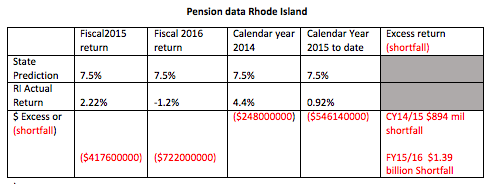 Pension returns in Rhode Island are so poor [over] the last 2 years that a crisis may re-emerge at the state level and require more cuts to retiree benefits. The data below includes returns for the State Pension plan from January 2014 until October 31, 2015. The State of Rhode Island Investment Commission estimates that the pension assets will return 7.5% after fees and compound for 24 years. I’ve shown readers how Jack Bogle and Warren Buffett think that estimate is irresponsible and immoral and should be well below 6% especially for a poorly funded pension plan like Rhode Island. Here’s how the pension plan assets - which includes hundreds of investments, dozens of managers and hedge fund managers, and millions in fees, have performed over the last two years.
