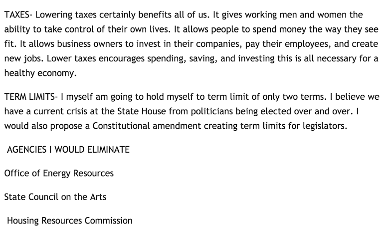I myself am going to hold myself to term limit of only two terms. I believe we have a current crisis at the State House from politicians being elected over and over. I would also propose a Constitutional amendment creating term limits for legislators.
