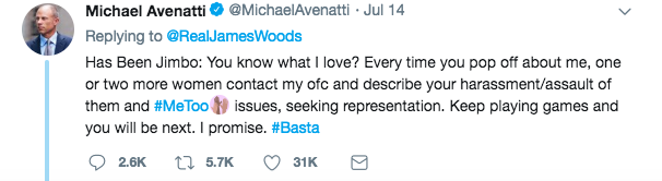 "Has been Jimbo. You know what I love? Every time you pop off about me, one or two more women contact my ofc and describe your harassment/assault of them and #MeToo issues, seeking representation. Keep playing games, and you will be next. I promise. #Basta"