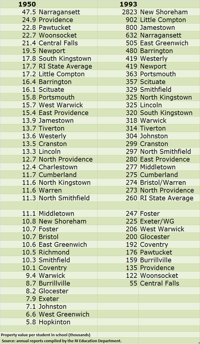 Apart from Narragansett, which in 1950 had only 400 students in its schools, the richest places in the state back then were, in order, Providence, Pawtucket, Woonsocket, and Central Falls. By the 1960s, they had sunk dramatically, overtaken by the new suburbs. Still, as late as the early 1980s, Providence was still only halfway down this list. By the early 1990s, the list had assumed its modern shape, and what were once the richest places in the state had become the poorest. Since then, the order in the list has remained pretty much the same, but the distance between the top and bottom has grown substantially.