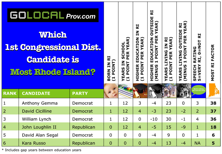 Loughlin and Segal lag behind. How far behind? Gemma (38), Cicilline (37) and Lynch (36) are all bunched at the top of the Most Rhode Island scoring, Loughlin scores 18 and Segal's score of 6 raises the question, is he a candidate for congress or just a guy stopping at the visitors center looking for a map.