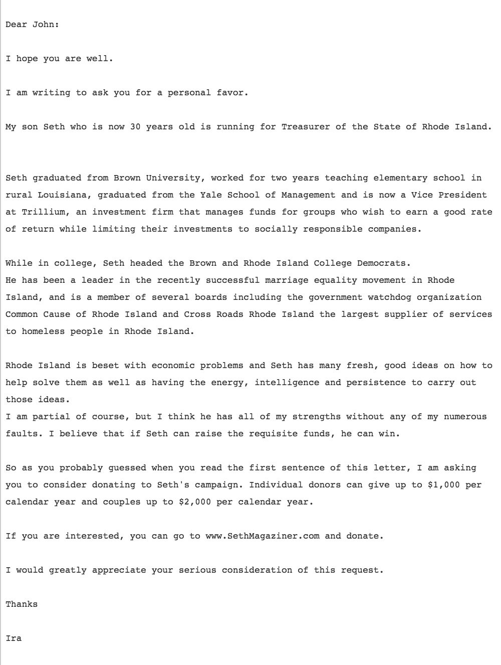 So as you probably guessed when you read the first sentence of this letter, I am asking you to consider donating to Seth's campaign. Individual donors can give up to $1,000 per calendar year and couples up to $2,000 per calendar year. If you are interested, you can go to www.SethMagaziner.com and donate. I would greatly appreciate your serious consideration of this request. Thanks Ira