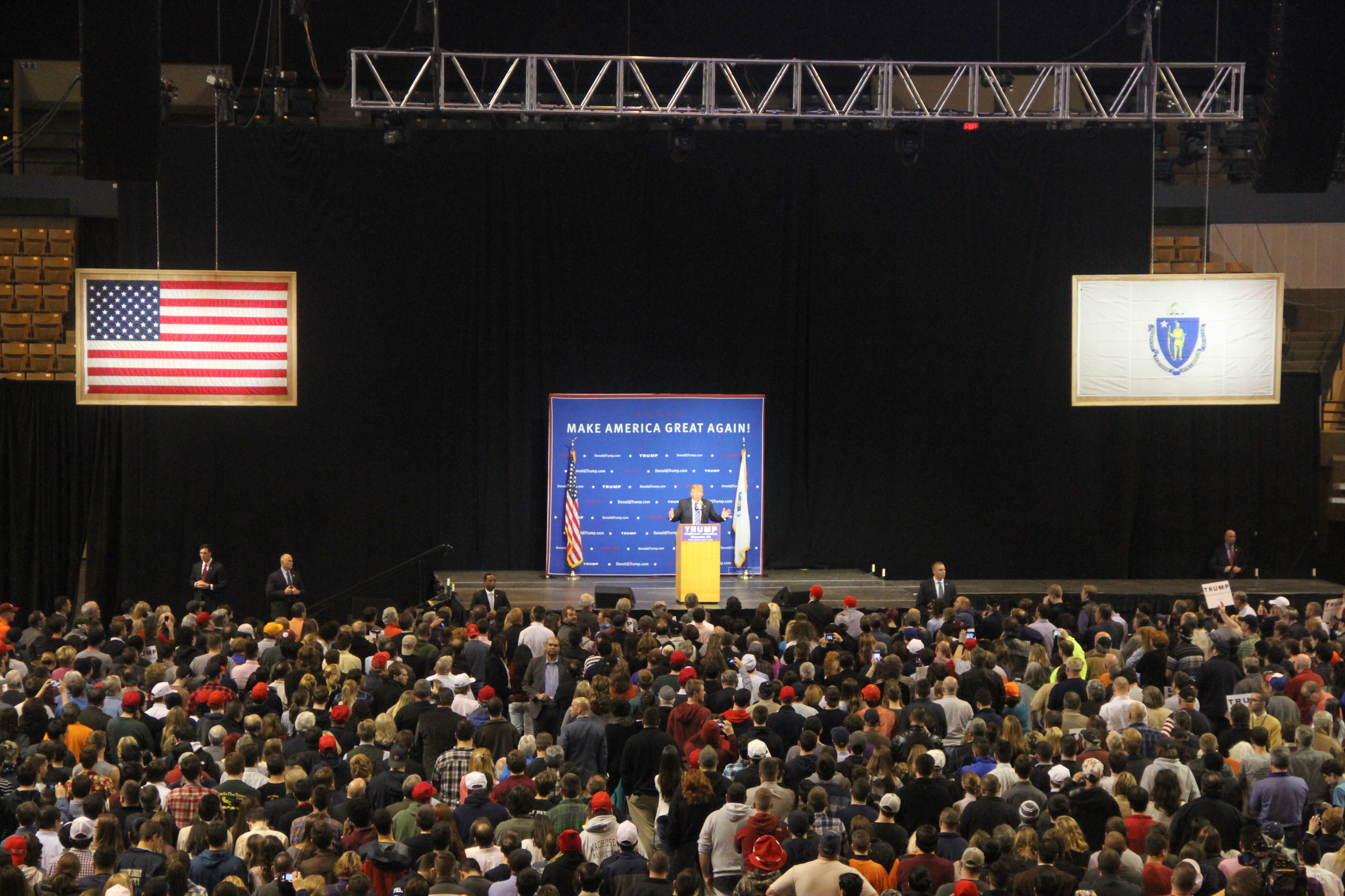 GET THE LATEST BREAKING NEWS HERE -- SIGN UP FOR GOLOCAL FREE DAILY EBLASTTrump endeared himself quickly to the Worcester crowd by namechecking Patriots quarterback Tom Brady in the opening lines of his speech. The audience went wild when Trump brought up the undefeated Patriots, and didn’t quiet for most of the night. It’s not the first time that Trump and Brady have been linked. A Donald Trump “Make America Great Again” hat was spotted in Brady’s locker during the preseason.