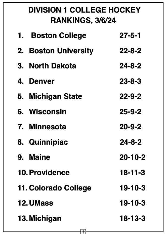 The Friars have hovered around their #10 ranking for most of the season. The NCAA only takes 16 teams for its tournament, so seemingly PC (18-11-3) at #10 should be safe with only two regular-season games remaining, tonight at home against #2 ranked Boston University (22-8-2) and Saturday against Northeastern at Schneider (16-15-2). PC is actually not a sure thing at this point. The NCAA takes the winners of the six college hockey conferences and then the ten teams with the highest pairwise ratings. The pairwise rating is a sophisticated system that provides a 4-digit rating based on wins, wins against top teams, close losses, wins on the road, etc. While PC is ranked #10, the teams just behind the Friars—Colorado College, UMass, Michigan, St. Cloud State, Western Michigan, and Cornell—are all bunched very closely to the Friars. So, the Friars have to still keep winning in their last two regular-season games and in the Hockey East tournament that begins on March 13.