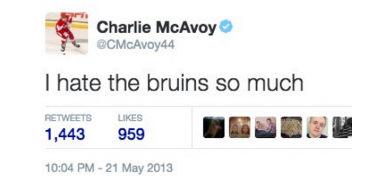 In the ultimate display of karma, irony or whatever other word you want to put it in, Boston Bruins 2016 draft pick Charlie McAvoy tweeted "I hate the bruins so much" in 2013.