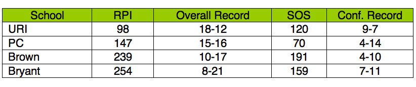 For Brown and Bryant the seasons are over, but Tuesday night is the beginning of a glimmer of hope for both URI and PC to fight there way to the NCAA Men's Basketball Tourney. Who among the four Division I teams has the strongest RPI rating?