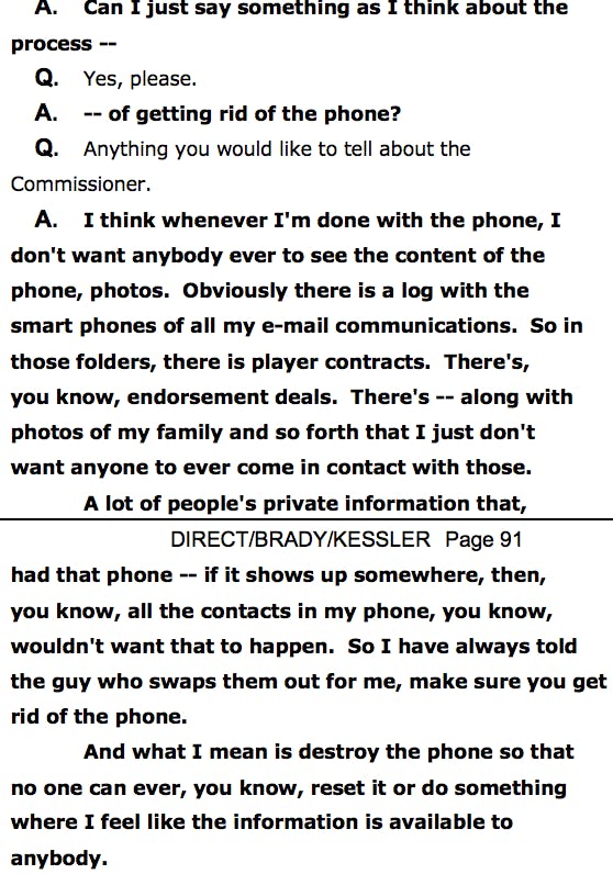 "I think that whenever I'm done with the phone, I don't want anybody ever to see the content of the phone, photos. Obviously there is a log with the smart phones of all my e-mail communications. So in those folders, there is player contracts. There's, you know, endorsement deals. There's-- along with photos of my family and so forth that I just don't want anyone to ever come in contact with those.