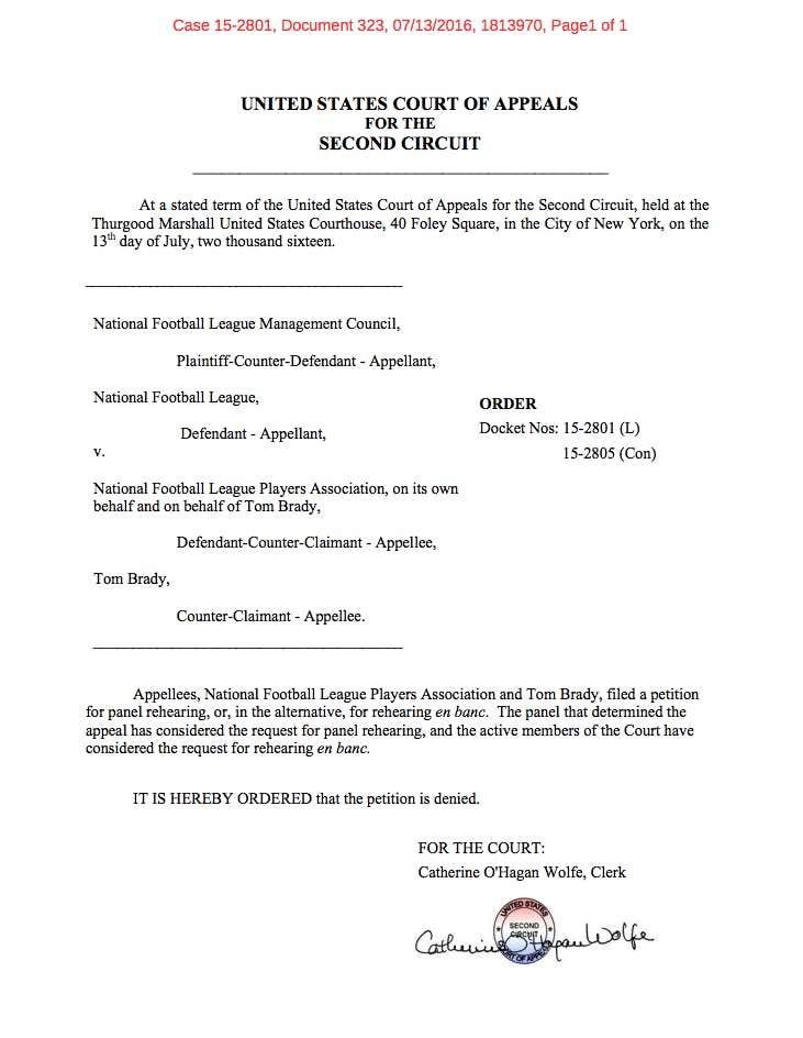 Brady was asking for re-hearing in front of the full 2nd Circuit Court of Appeals after a three judge panel reinstated Brady's 4-game suspension back in April.