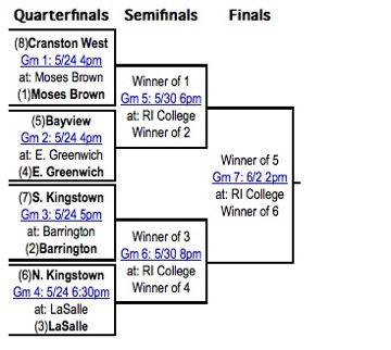 2nd-seed Barrington High School (14-3) will take on 7th-seed South Kingstown (4-9) at 5 p.m. tonight in Barrington. The winner of that game will face the winner of 3rd-seed La Salle (10-3) and 6th-seed North Kingstown (8-6), who will face off at 6:30 p.m. tonight in Providence.