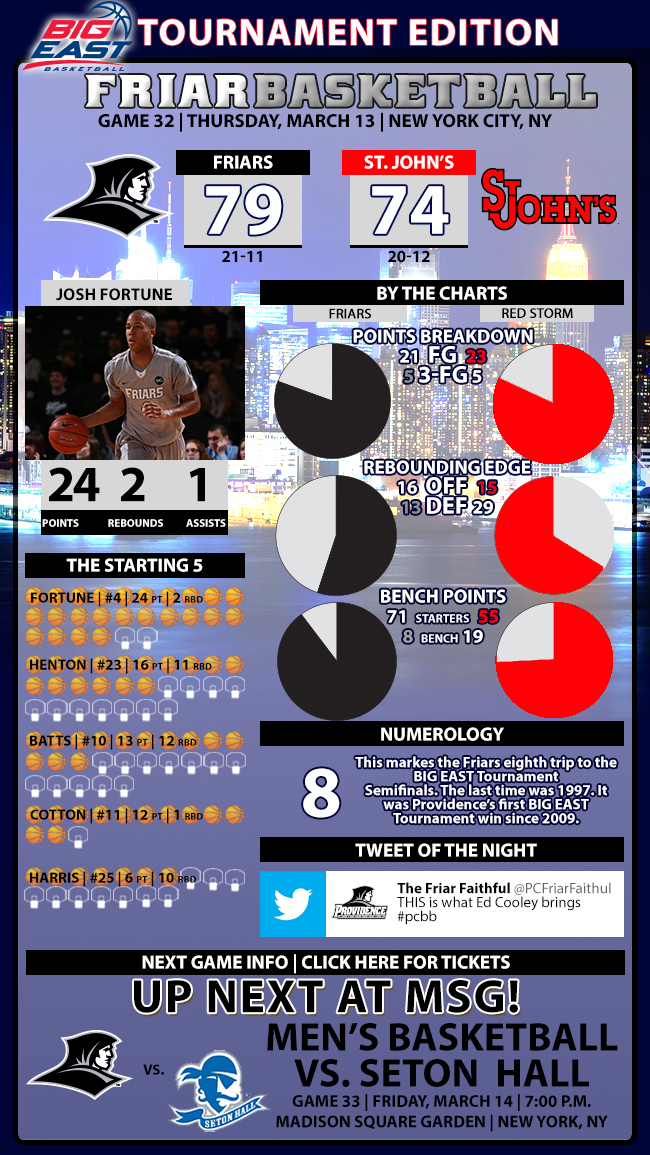 Providence (21-11) wins for the first time in the Big East Tournament since 2009, snapping a five-game losing streak in the process. The Friars had actually lost 10 of their last 11 at the Garden, dating back to 2003...PC will make its first appearance in the conference semifinals since 1997 as well, since losing to Villanova on their way to an Elite 8 finish in the NCAA Tournament...they will face 8th seeded Seton Hall, which stunned #1 Villanova on a buzzer-beater from Sterling Gibbs, 64-63. Providence split two games with the Pirates during the regular season, losing 81-80 in double overtime on New Years' Eve at the Dunk, and winning 74-69 in Newark February 28th...there were five ties and 13 lead changes in Thursday's game, despite the close call at the end...Fortune's 24 points were a career best, surpassing the 18 he scored against Penn State during his freshman season...four Friars finished with 10 or more rebounds, including double-doubles from Henton (16 points,11 rebounds) and Batts (13 points, 12 boards). Tyler Harris contributed 10 rebounds (six offensive) to go with six points, and Desrosiers scored eight points, pulled down 10 boards and blocked four shots...Cotton was held to 12 points on 1-10 shooting overall...second chance points were the difference (17-12 PC edge) thanks to 16 offensive rebounds and a 49-44 overall advantage on the boards...the 49 rebounds tied a season high, and were the most in a tournament game for Providence...PC's semifinal matchup Friday night with Seton Hall (6:45 pm on 103.7 FM and friars.com) will be the 2nd ever in the Big East semis against SHU, and first since 1993 (69-60 SHU win)...if you're wondering about NCAA possibilities for PC, there have been 109 Big East teams in the leagues' 34-year history with at least 20 wins, 10 in conference play, and at least one in the post-season tournament...and 106 of them advanced to the tournament...