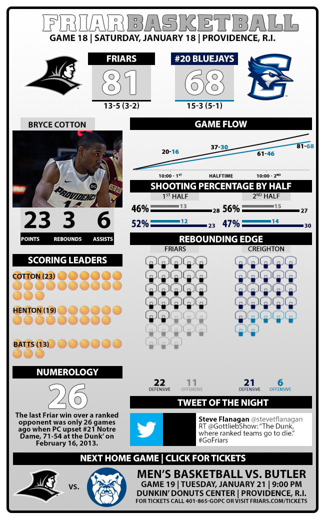 All five Providence starters reached double-digits in scoring (Cotton 23, his 8th straight game with 20+ points; Henton 19, Batts 13, Harris 10 and Fortune 10)…Batts pulled down a game-high nine rebounds to give Providence a 33-27 edge on the boards. Defensively, junior Carson Desrosiers recorded three blocks, all coming in the second half…with Batts and Harris in foul trouble much of the second half, PC got a huge lift from Desrosiers and senior Ted Bancroft off of the bench…the Friars shot a season-best 51% from the floor, 35% from three and hit just 72% from the line (still leading the nation in FT’s at 80%)…the win for PC snapped a 10-game Creighton win streak, 6th longest in the country coming into the game. Over the previous 392 minutes played during the streak, the Blue Jays had led for all but 26 minutes total in those 10 games. They never led in 40 minutes at the Dunk Saturday night…CU averaged a nation-best 11.2 made three’s, shooting better than 43% from the arc, but hit just four-of-19 against the Friar man-to-man defense…McDermott led the Blue Jays with 21 points, four below his Big East-best average, and was apparently fighting off a stomach bug prior to the tip off. Should he claim a 3rd straight 1st team all-American berth this year, McDermott would follow in the footsteps of only two other 3-time 1st team all-Americans – Patrick Ewing and Wayman Tisdale…Junior guard Devin Brooks (Harlem, NY) was the only other Jay in double figures with 10. 6-7 senior Ethan Wragge, leading the Big East in three’s at 50%, managed just 2-for-8 on the night for eight points. He did, however, hit the 1000-point mark for his career in the game…Creighton had won their previous three road games each by double-digit margins…for PC, it’s their first win of the year over a Top 25 team (now 1-3) and the first since a 71-54 win over then #21 Notre Dame last season (2/16/13)…the game also marked the 11th meeting all-time between the Friars and Blue Jays, with PC leading the series 7-4. The last game was played in 2000 (a CU win in Kansas City) and the last Friar win came in 1981…Big East newcomer #2 plays Tuesday night at the Dunk with the Butler Bulldogs coming in for a 9:00 pm tip (8:45 pre-game on 103.7 FM and friars.com)…