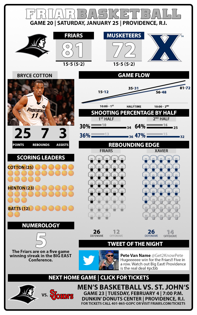 The meeting was just the 4th all-time for PC and XU on the basketball floor, and the Friars have now tied the series up at 2-2. The last game came in 1987, a 96-76 win in Providence…Xavier came into the game as one of the top shooting teams in the league, 2nd to Creighton in field goal percentage and in three-pointers. PC held the Musketeers to 41% from the floor and just three-for-18 (16%) from outside the arc…as a result of forcing the tough two’s, as the coaching staff preaches, XU outscored PC 46-24 in the paint…Xavier also outrebounded the Friars by a slim 40-38 margin, and the Musketeers were the BE leader in rebounding coming in as well…four Friars finished in double figures, as Batts (12 points, eight rebounds) and Harris (12 points, six boards) followed Cotton (25 points, seven assists) and Henton’s efforts…Carson Desrosiers had a big day inside with seven rebounds, six blocks and numerous altered shots against the XU bigs…Xavier’s Martin led their scoring with 19, Christon finished with 18 (16 in the second half) and 6-10 center Matt Stainbrook scored 11 points with nine boards…PC will look to extend their Big East win streak to six games at a place where they’ve never won previously. Next up, the Bradley Center in Milwaukee, WI against Marquette Thursday night (6:45 pm on 103.7 FM and friars.com), where the Friars are 0-7 all time. A win would be Providence’s longest league winning streak since Rick Pitino’s ’87 team won six straight in one stretch on their way to the Final Four…the Friar Legends Forever Tradition continued at halftime of the game, as Joe Hassett, Kevin Stacom and Tracy Lis were all honored, and Hassett and Stacom's jerseys were raised into the Dunk rafters. Lis, as the all-time women's scoring leader at PC, will have her jersey banner hanging at Alumni Hall on campus...