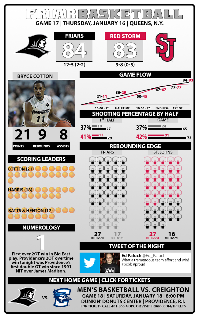 The win in two overtimes is the first for Providence in almost 23 years, since a 98-93 double OT win over James Madison at the Dunk in the NIT on March 13, 1991…PC managed to shoot just 37% from the floor, but used a 30-for-36 performance from the foul line to stay in it, and win it. The Friars remain the #1 free throw shooting team in the nation at 80%...Cotton’s 21 points, nine rebounds and eight assists were supported by 17 points and nine rebounds from Henton and Kadeem Batts, who fouled out with 1:58 left in regulation…Harris added 18 for PC, while St. John’s had six players in double figures. JaKarr Sampson led with 16 points, Greene scored 15 and Harrison 14 (5 under his average), but the Red Storm could only manage 1-for-10 from deep. They also kept themselves in it by hitting free throws, going 20-of-24 from the line…27 of St. John’s 31 field goals were scored in the paint, but offensive rebounds by Providence helped offset that inside advantage with 17 2nd chance points…the loss was the first this season for St. John’s at Carnesecca Arena on campus, and just the 5th loss at home under Steve Lavin in 4+ seasons. They’re now 6-1 this season…PC’s defense also forced 14 SJU turnovers, scoring 20 points on the miscues…the first meeting against one of the three Big East newcomers is Saturday, as the Creighton Blue Jays, led by national player of the year candidate Doug McDermott, get their first taste of the Dunkin Donuts Center in an 8:00 pm tip off (7:45 pre-game on 103.7 FM and friars.com)…