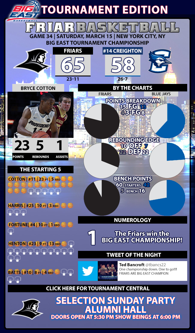 Cotton led PC (23-11) with 23 points and as mentioned above, claimed the Dave Gavitt trophy as the tournament MVP despite shooting just 6-for-24 in the first two games against St. John’s and Seton Hall. He was 8-for-18 against Creighton…Fortune and Harris each had 10 points for PC, while Henton finished with nine points and a game-high 13 rebounds. Cotton, Henton, Fortune and Harris played all 40 minutes in the game...Henton was also named to the all-tournament team, along with McDermott (27 points) and Austin Chatman (four points, eight assists) for the Blue Jays…Seton Hall’s Eugene Teague and Xavier’s Semaj Christon were also named to the team…for the game, Creighton shot just 8-for-30 from three (26%), well below their nation-leading average of 42%. Overall, CU managed just 43% from the floor against the Friar defense, and averaged better than 50% coming in…PC won the game from the line, as the nation’s #1 foul-shooting team hit 23-of-26 (88%) from the stripe, and outrebounded the Jays 32-29…from Creighton head coach Greg McDermott: “Obviously, they’ve (PC) overcome a tremendous amount of adversity this season and to their credit, they continue to forge forward. So although I hate to lose in a game like this, if I have to lose, losing to someone like Ed Cooley is as good as it could possibly be…” Creighton (26-7) was gunning for its 3rd straight post-season title, after having won the last two they played as members of the Missouri Valley Conference…as Big East champs, Providence receives the automatic bid to next week’s NCAA Tournament. The Friars will await their seeding and their destination Sunday night, and the team is sponsoring a tournament selection show viewing at 5:30 pm at Alumni Hall on campus for all Friar fans, free of charge...