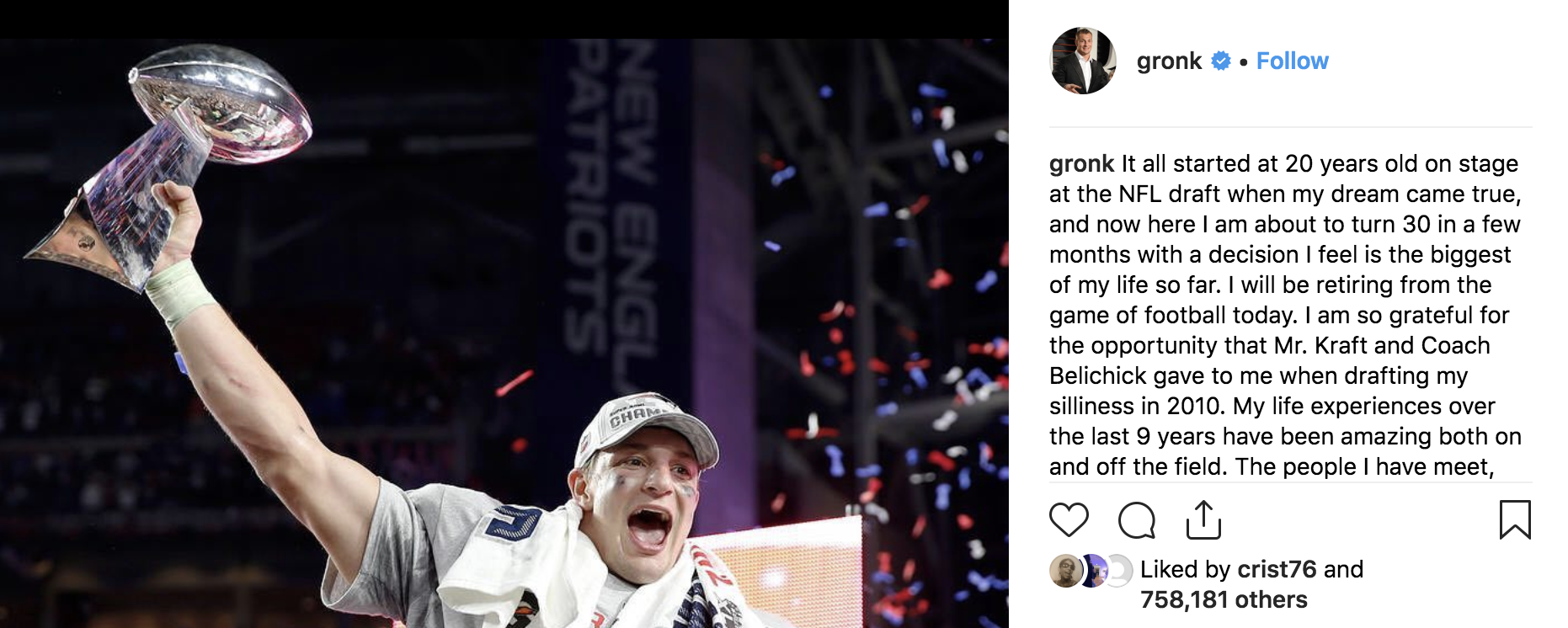 Gronkowski Announces Retirement on Instagram