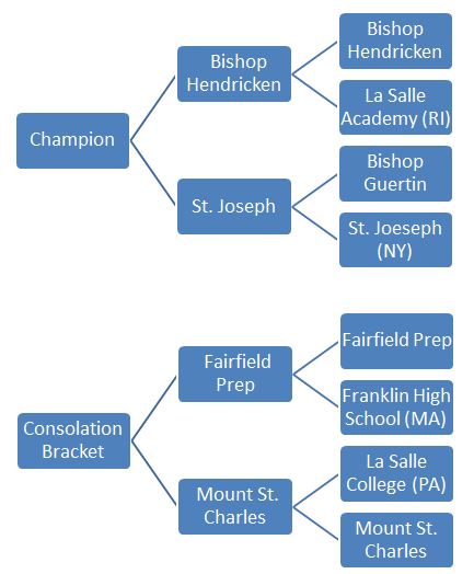 The updated bracket is posted to the right. Remember that all 8 teams are playing Saturday, with La Salle College and Franklin HS matching up in the consolation bracket, and La Salle Academy meeting Bishop Guertin in the 3rd place game.