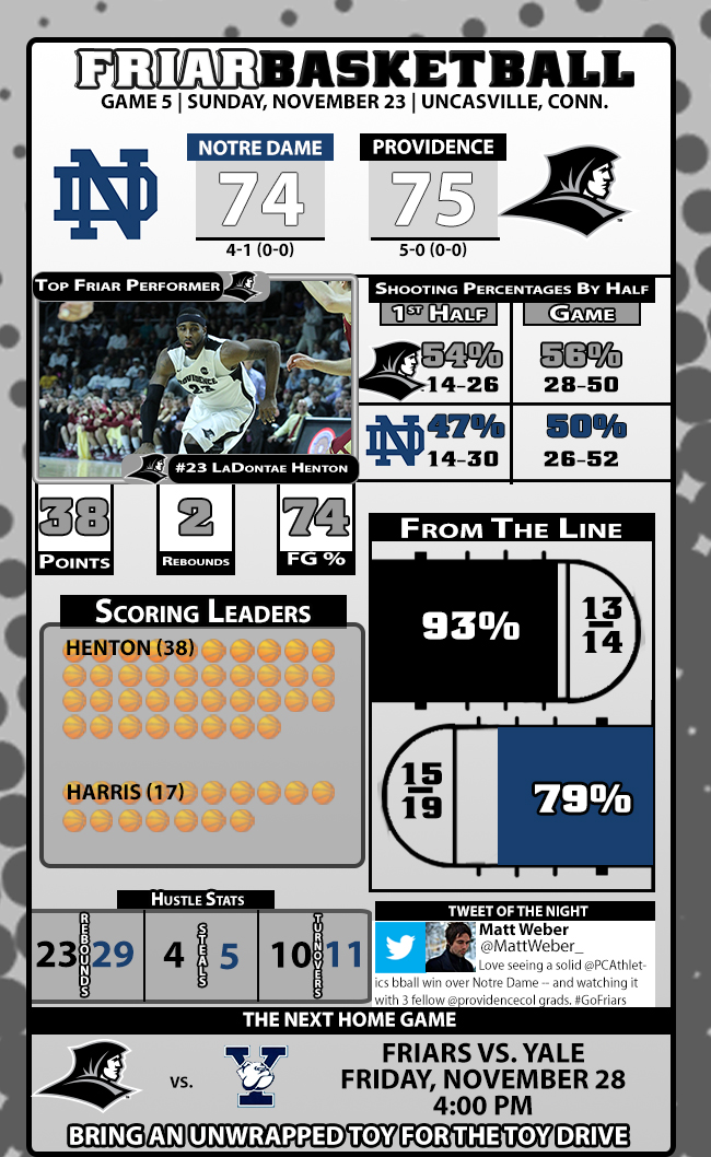 LaDontae Henton put up a career high 38 points, and the Providence Friars (5-0) defeated the (4-1) Notre Dame Fighting Irish 75-74 in the final game of the Hall of Fame tip-off tournament at Mohegan Sun.