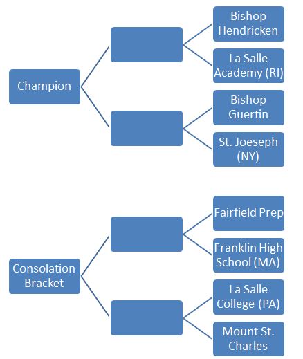 Please note every team will play Saturday. The winner of Hendricken and La Salle will play the winner of Guertin and St. Joseph's in the Championship game, and the losers of those semifinal games will play each other Saturday as well. The winners of the Mount/La Salle College and Fairfield/Franklin games will play each other Saturday, and the losers of those 2 games will meet each other on Saturday as well.