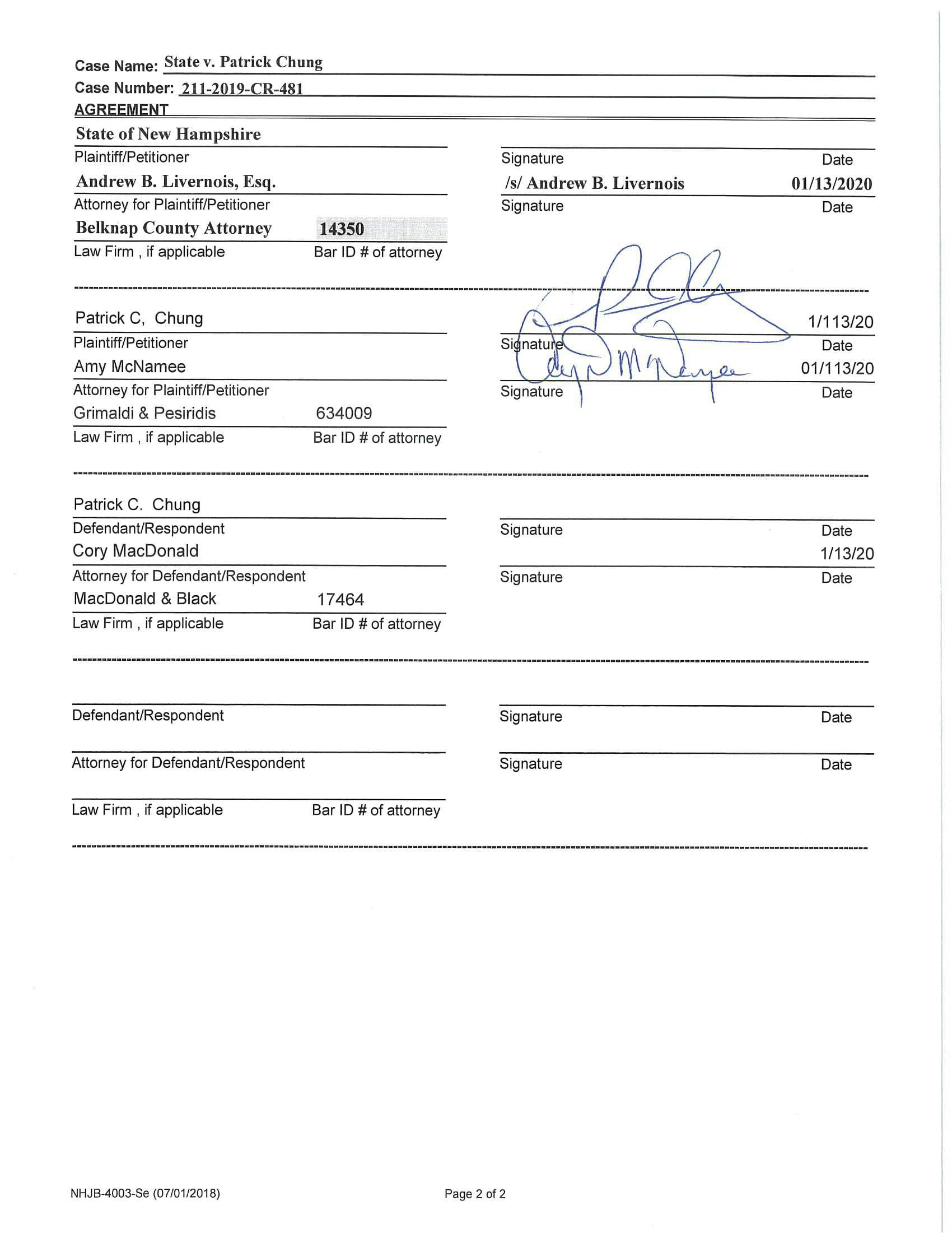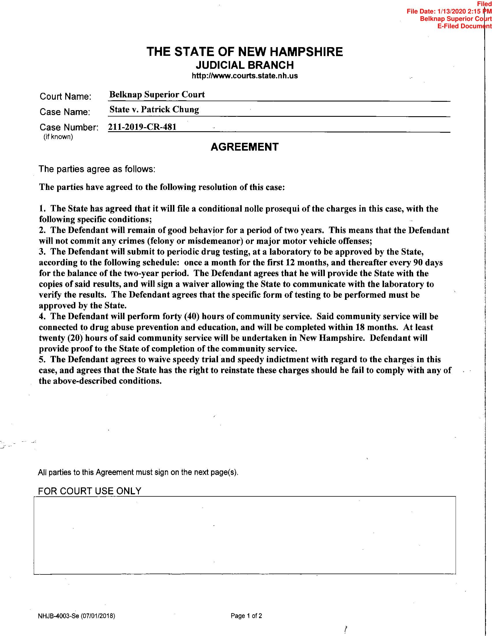 “There are several factors which led the State to agree to this resolution. First, Mr. Chung has no prior criminal record nor any prior involvement with the criminal justice system. Second, Mr. Chung was fully cooperative with the Meredith Police Department on the evening of the incident involved," said Belknap County Attorney Andrew Livernois in a statement.