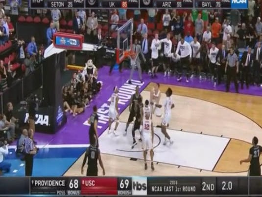 Providence trailed 69-68 with three seconds left in the game when Rodney Bullock took an inbounds pass from Drew Edwards under the Trojans basket and layed it in as time expired giving PC a 70-69 win.