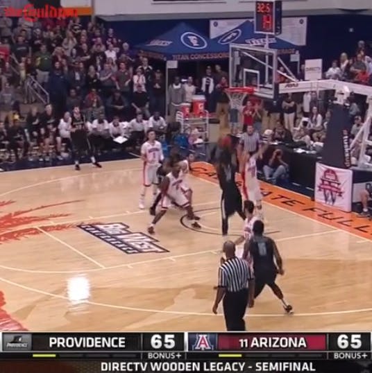In the early season Wooden Legacy Award tournament, Kris Dunn hit this spinning step back jumper to give Providence a 67-65 lead over #11 Arizona.