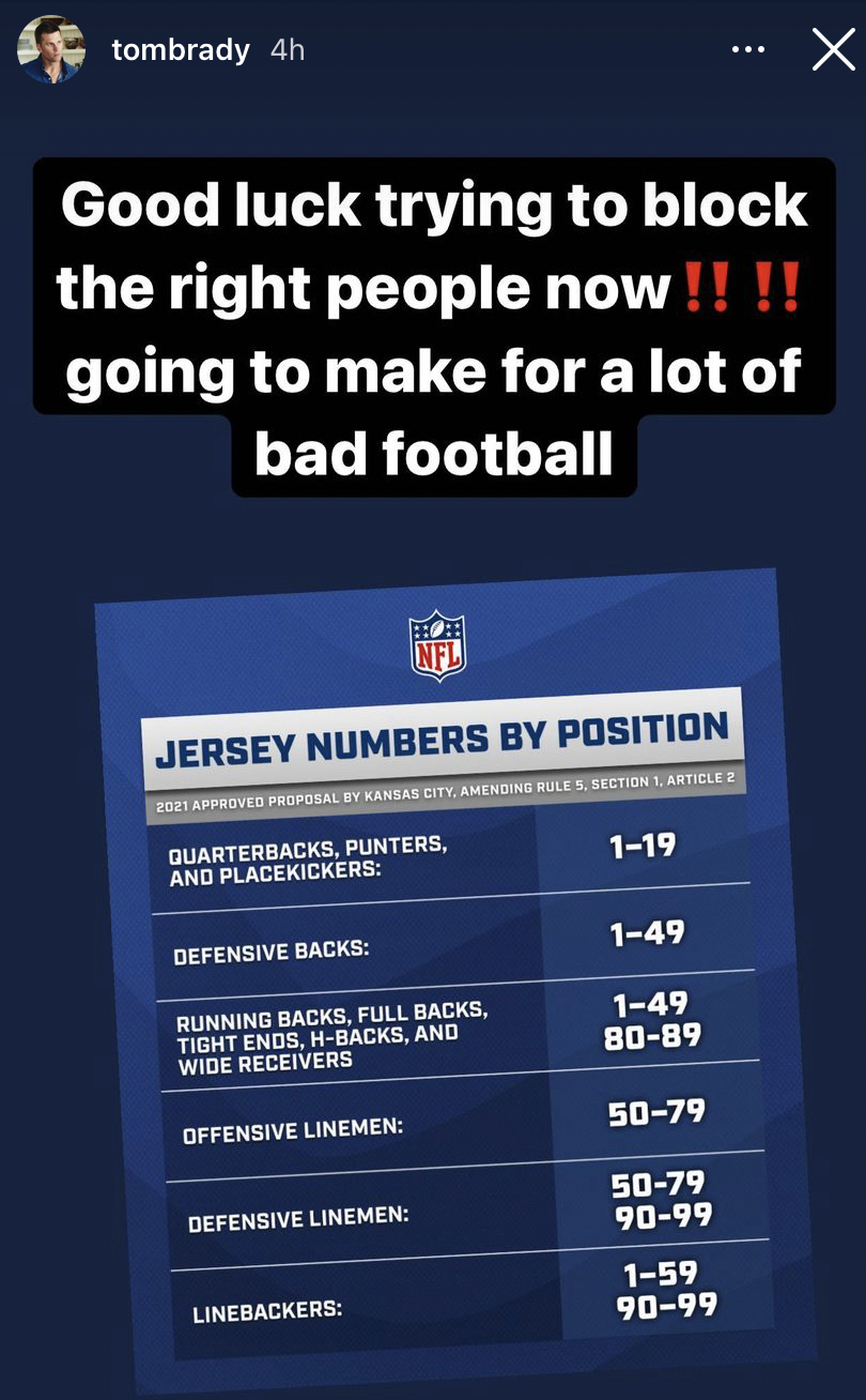 Less than a day after the league announced restrictions on jersey numbers by positions, Brady went on Instagram to point out his dissatisfaction with the change.