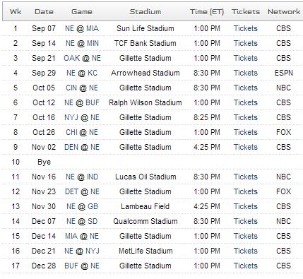 --Division Games: The Patriots’ 2 games with the Jets come in Week 7 (Home) and Week 16 (Away). The Patriots play in Buffalo Week 6 and host the Bills in the season finale in Week 17. In addition to opening in Miami, the Pats host the Dolphins in Week 15.