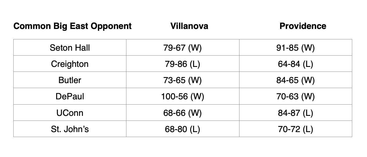 Here are some scores for PC and Villanova against common Big East opponents: