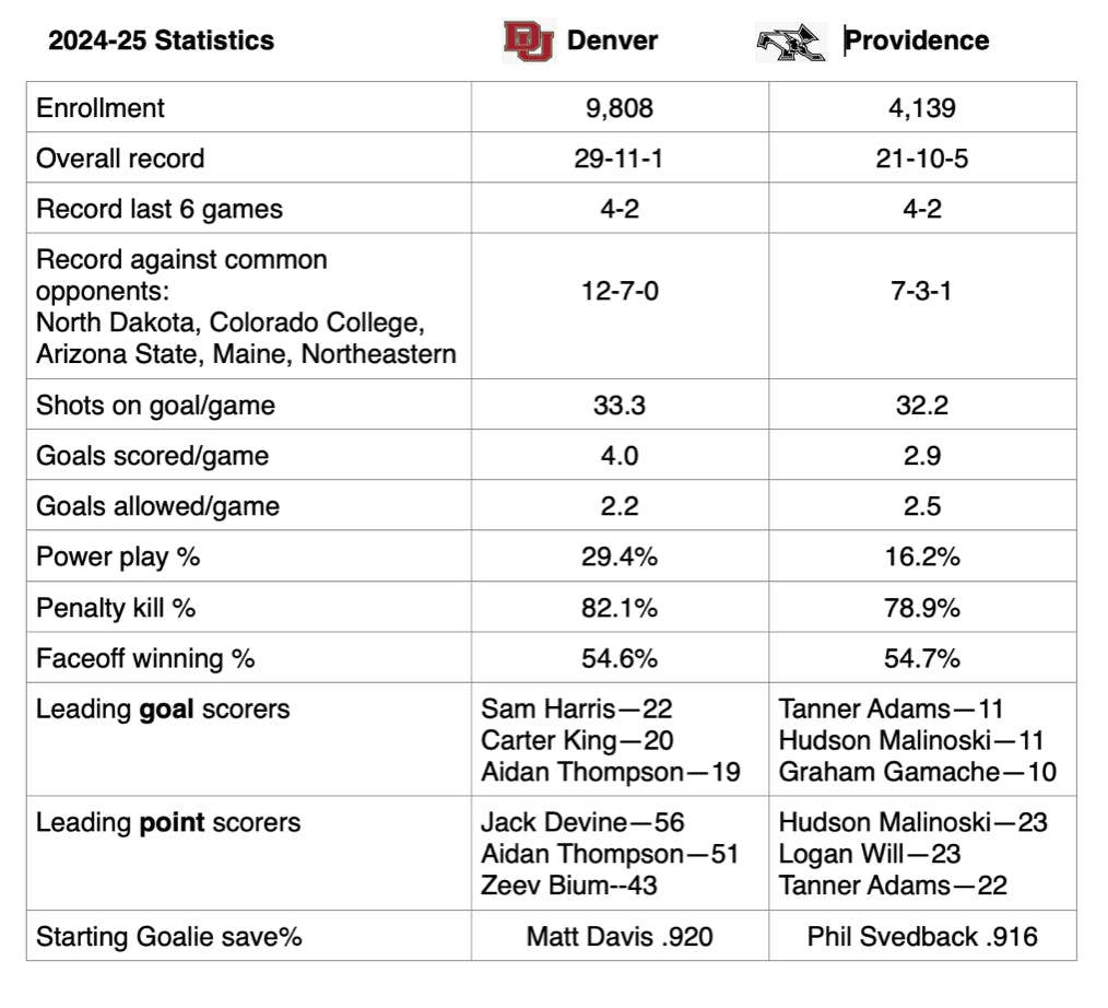 Denver is a tough draw for PC this year. In fact, PC has the toughest draw of any team in the tournament. Denver is the reigning National Champion. And if PC beats Denver, they then will likely play the #1 team in the country, Boston College.
