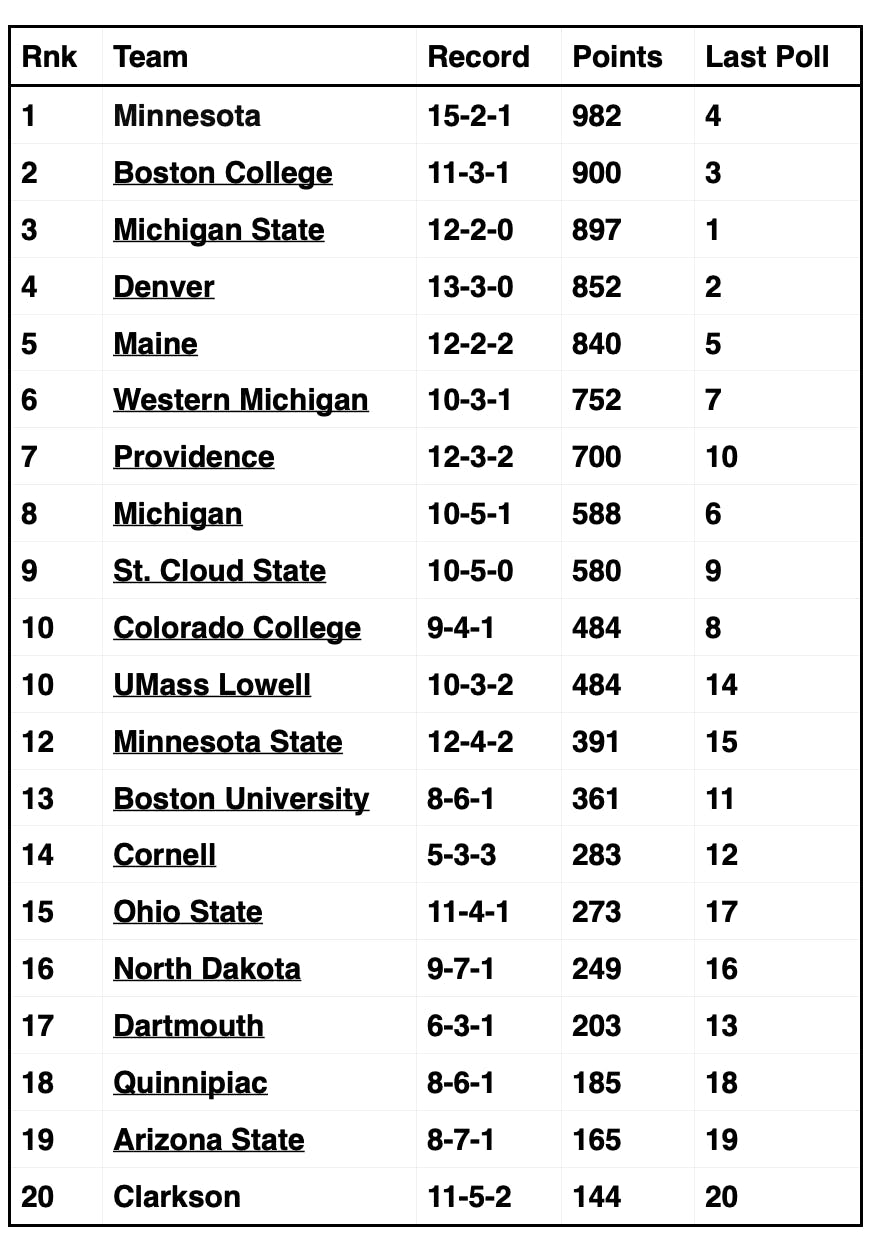 Some observations on these rankings: There are 65 Division 1 college hockey teams in the country. Hockey East has 4 of the top 10 ranked teams—Boston College, Maine, Providence, and UMass Lowell. Denver, the preseason favorite to win the NCAA championship this season, occupied the #1 spot for several weeks, going 12-0. They have lost 3 out of their last four games and have slid to #4. This is the first time this year that the Minnesota Gophers have been ranked #1, after shutting out and stunning Michigan twice this past weekend. The Boston College Eagles have rotated between the #1 and #3 rankings in the last 3 weeks.