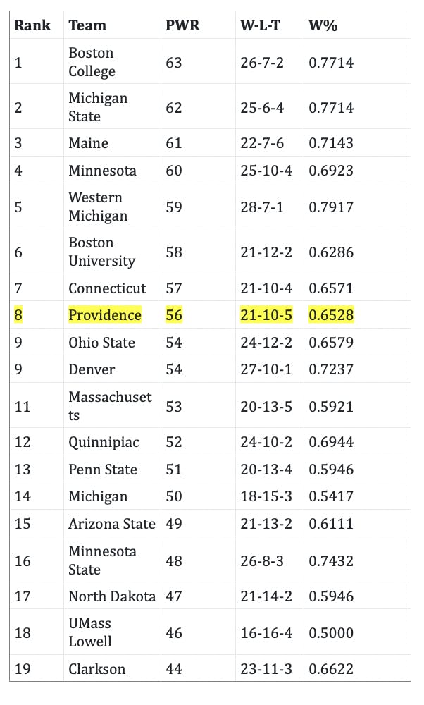 The NCAA will select the 16 teams on Sunday, March 23rd, for the post-season road to the Frozen Four. Several college hockey leagues are still playing league tournament hockey and will finish up next weekend. Despite losing in the Hockey East quarterfinals, the Friars are in good shape to be selected for the NCAA tournament, no matter what the outcome of the remaining games of other teams. There are six college hockey leagues, and the winners of the tournaments will receive automatic bids. That leaves ten other teams to be selected as “at-large” selections. The NCAA uses a “pairwise” method of ranking teams for the NCAA selection which takes into consideration not only wins and losses, but strength of schedule, wins versus ranked teams, losses against weak teams, etc.